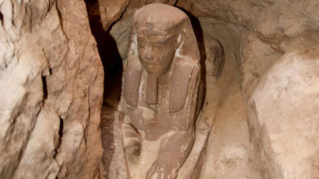 El Ministerio de Antigüedades informó el domingo que la esfinge hecha de piedra arenisca fue hallada en el templo de Kom Ombo durante labores para proteger el sitio de aguas subterráneas.