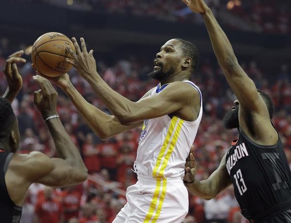 Kevin Durant anotó 37 puntos y Klay Thompson aportó otros 28 para encaminar a los Warriors de Golden State a un triunfo el lunes 119-106 en un anticipado duelo ante los Rockets de Houston en el primer juego de la final de la Conferencia Oeste.